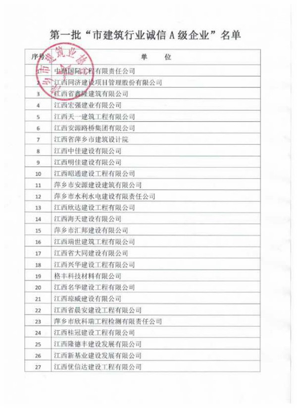 萍鄉(xiāng)市建筑業(yè)誠信等級A級企業(yè)